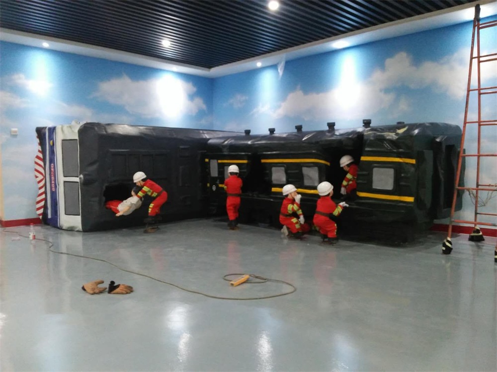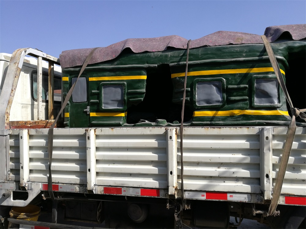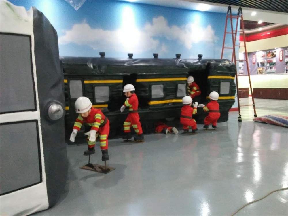 雕塑說明:雕塑整體場景以發(fā)生在淄博市境內(nèi)的一場火車碰撞事故救援現(xiàn)場為題材?;疖嚹P筒捎门菽袼芄に囍谱?,表面彩繪。消防人物雕塑采用玻璃鋼雕塑工藝制作。