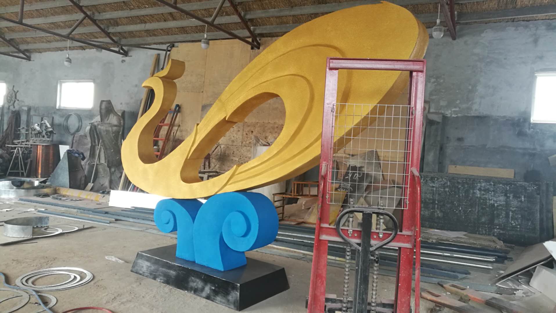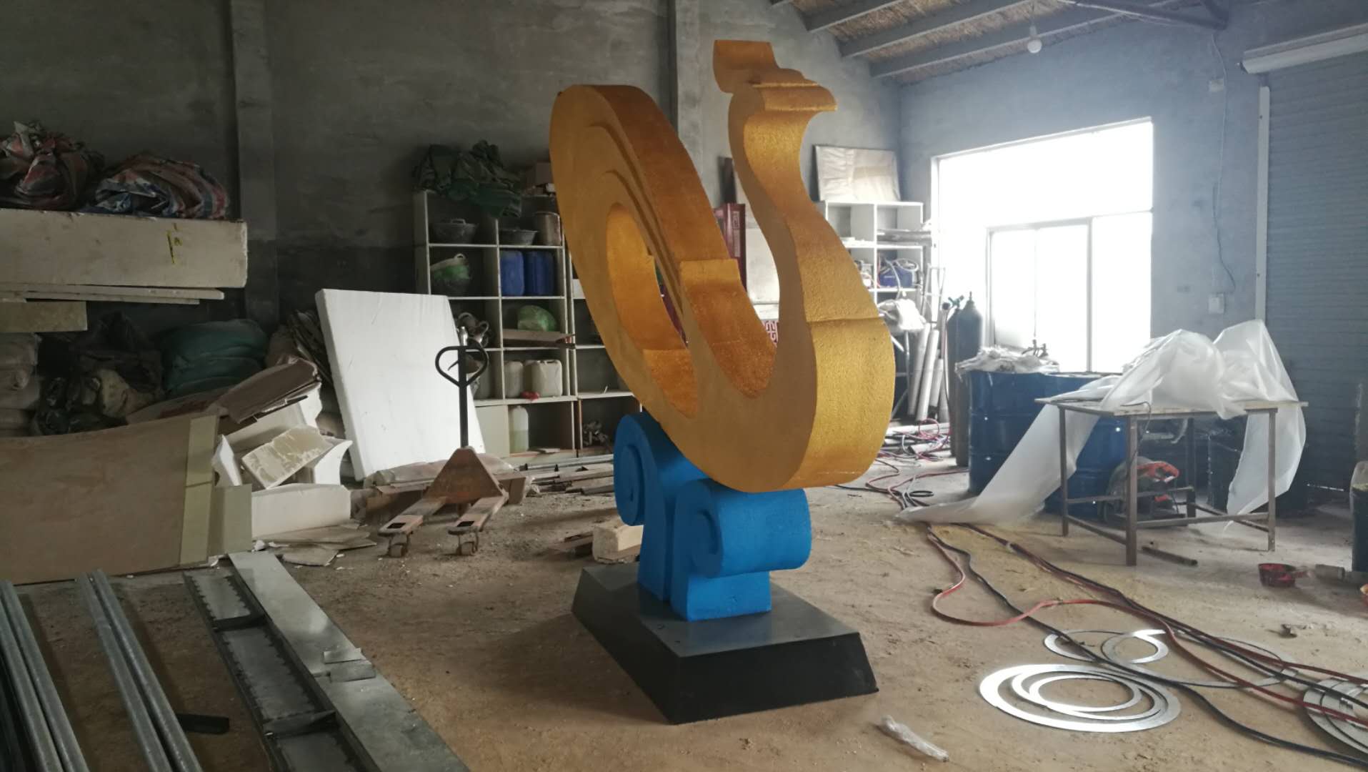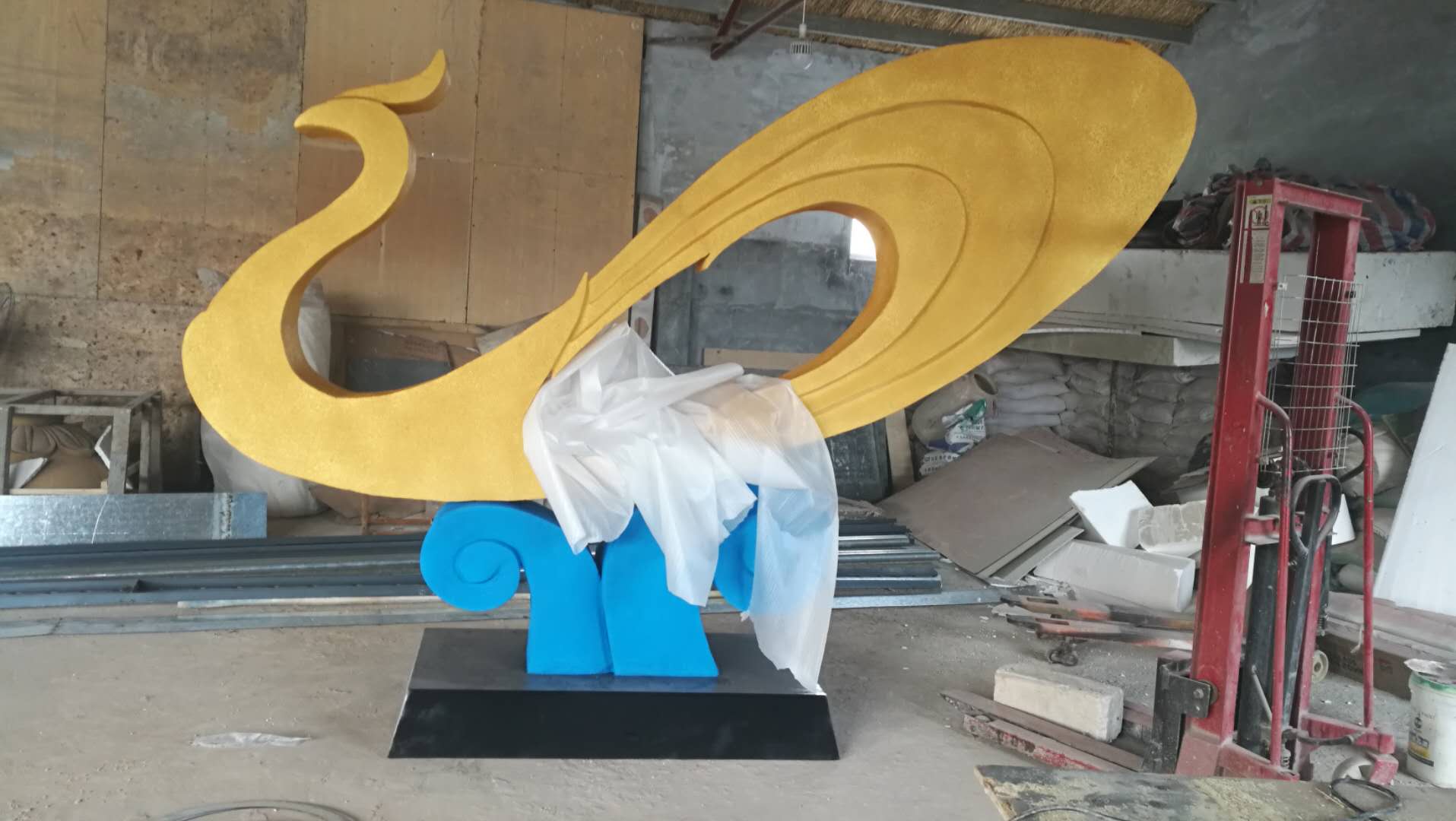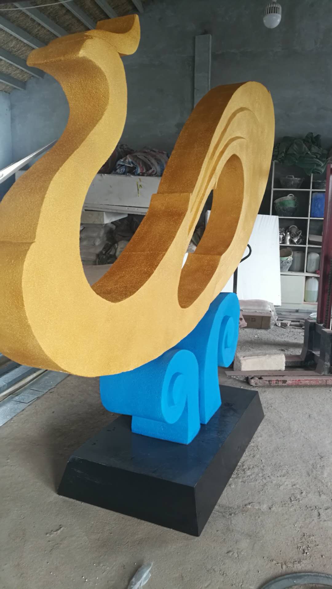 雕塑說(shuō)明:本雕塑根據(jù)碧桂園的logo創(chuàng)作設(shè)計(jì)。雕塑高2.7米,長(zhǎng)3.6米,上面孔雀表面沙金效果,浪花湖藍(lán)色,底座黑色。雕塑材質(zhì)為泡沫,表面仿砂巖效果,彩噴。