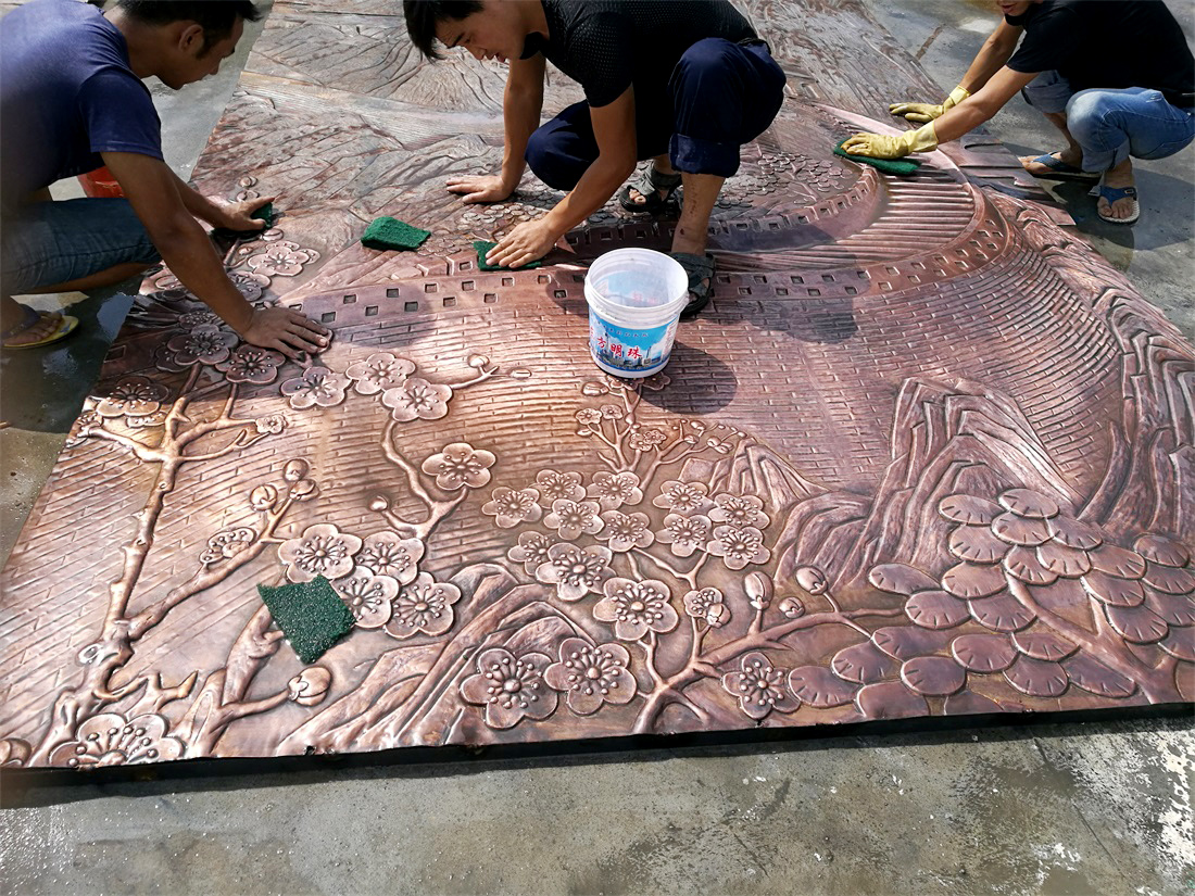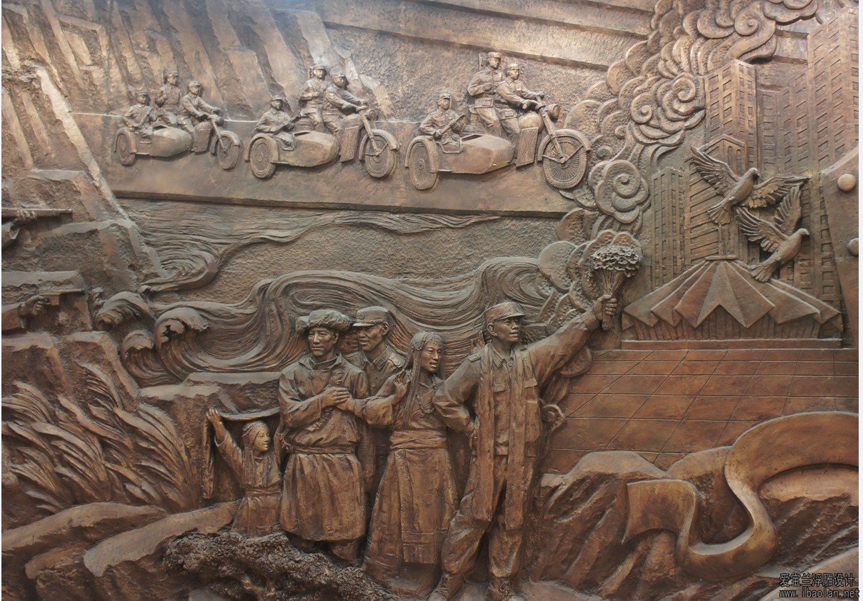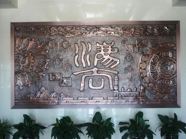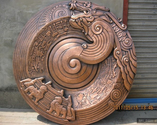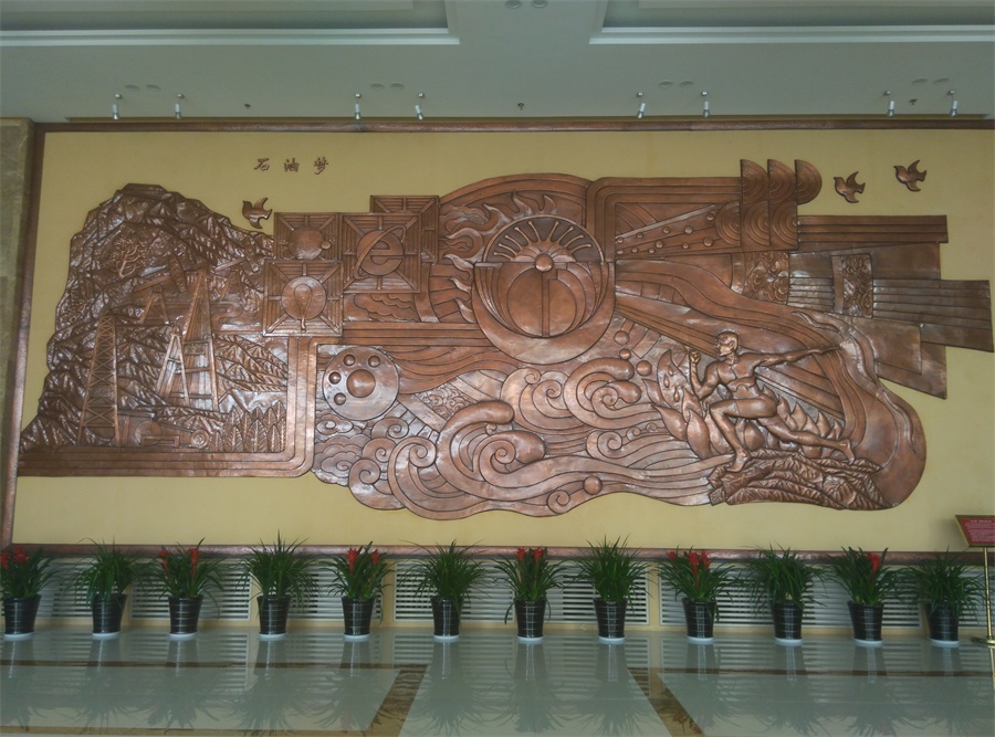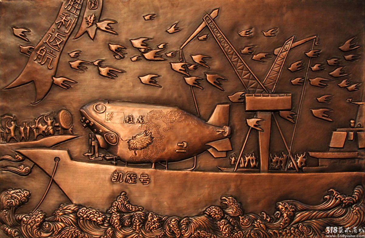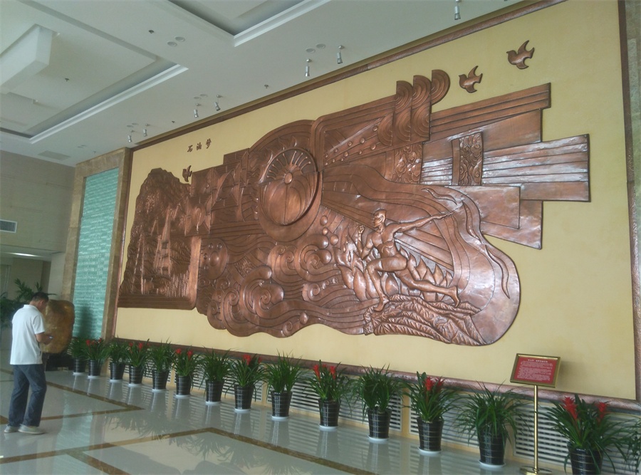 鍛銅雕塑,鍛銅浮雕展示。鍛銅浮雕(又叫鏨銅或敲銅),是利用銅材料的延展性興起來得鏨刻工藝,是我國傳統(tǒng)手工藝百花中的一枝奇葩。鍛銅雕塑的制作過程是先做出一個模子,然后用特制的膠粘在固定位置上,將銅板加熱后質(zhì)地變軟的銅板放在模子上用錘子進(jìn)行敲打,敲打后又恢復(fù)堅硬,這樣便可以成形,然后進(jìn)行著色處理,最終制作出藝術(shù)作品。
