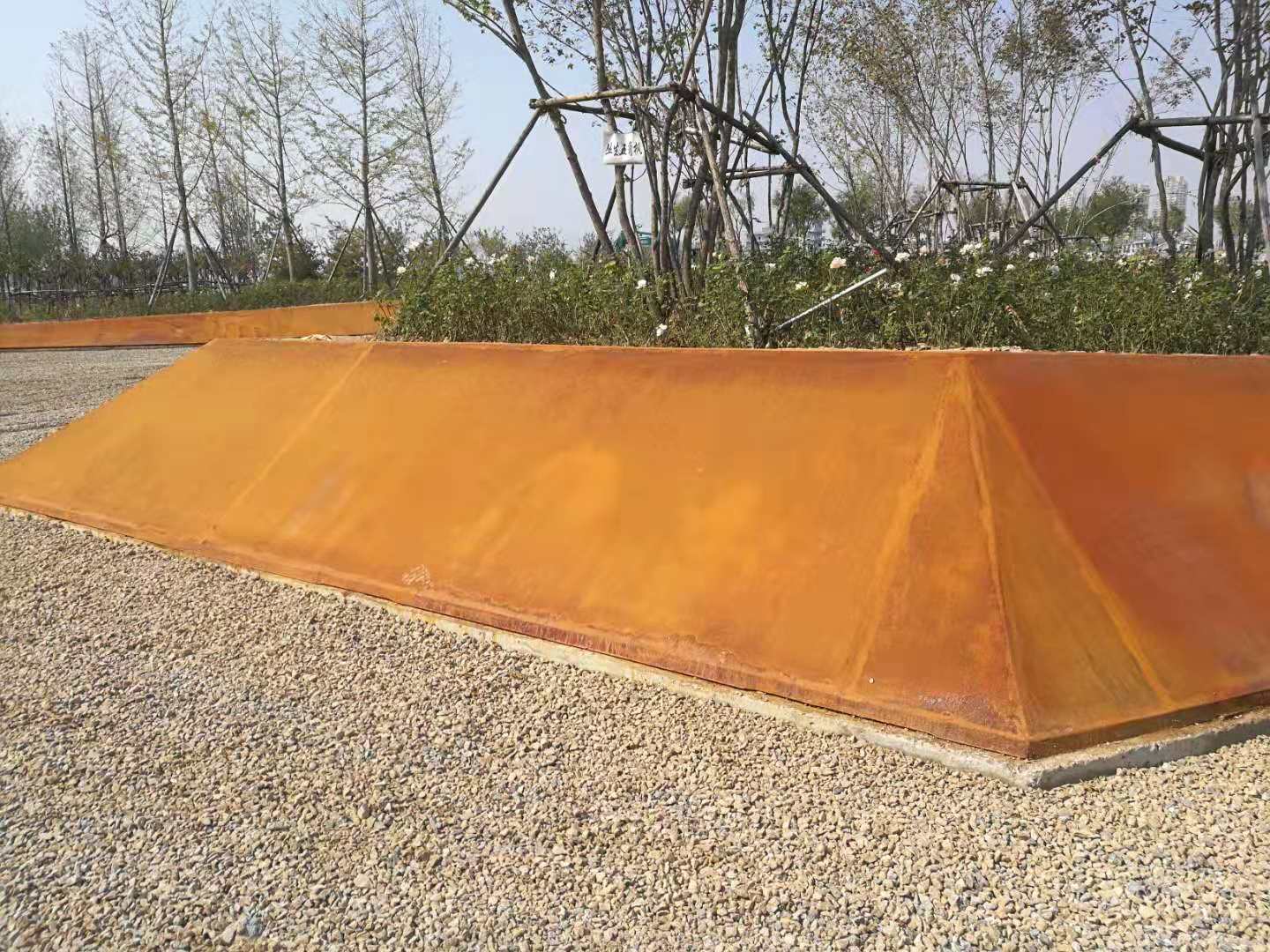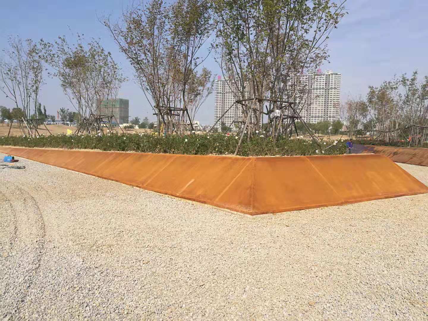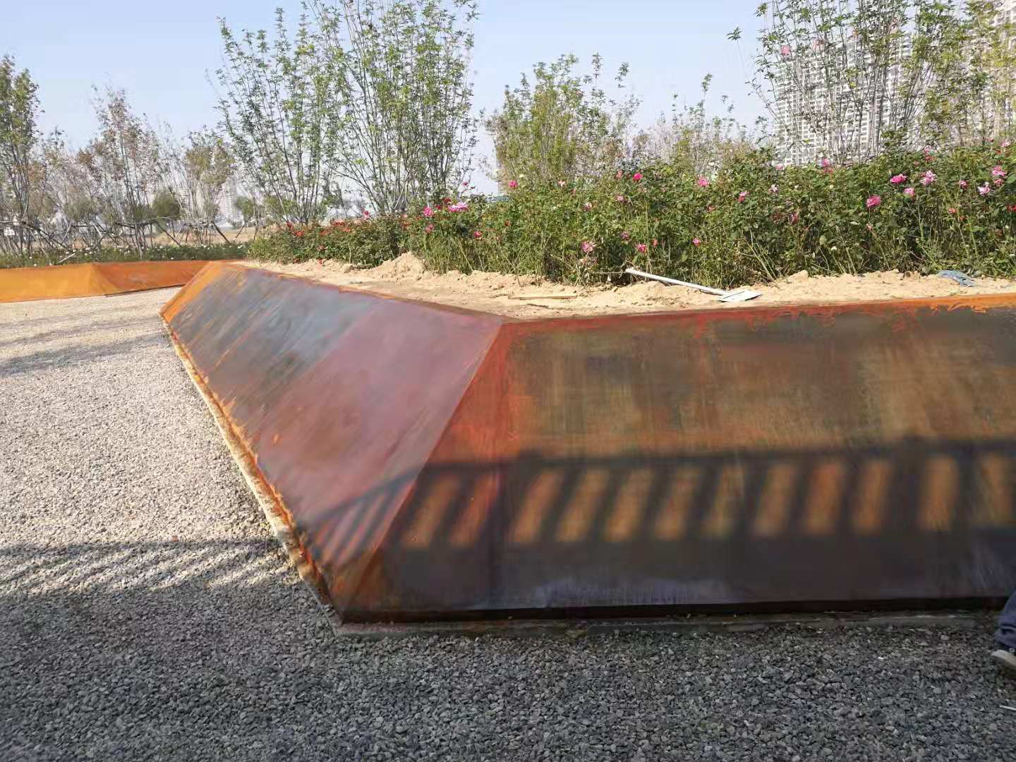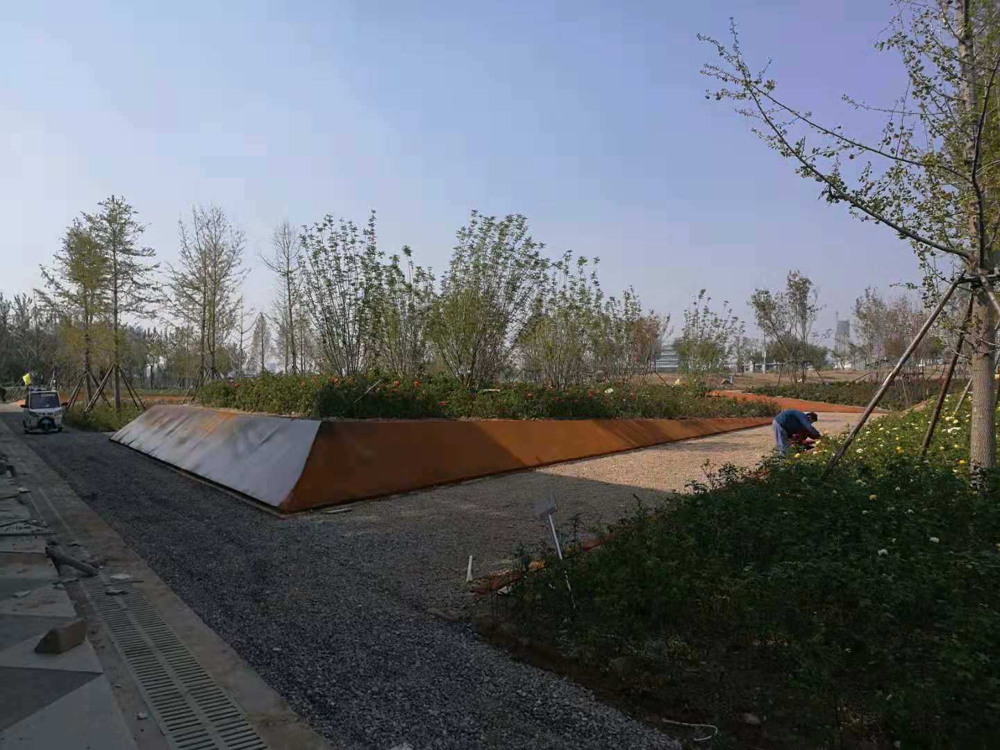 中海植物園即原來的中海景區(qū)東北角的原高爾夫球場區(qū)域,2018年改造升級(jí)為濱州中海植物園。所施工的銹板花池共7組,造型表面積共488平方米。造型板采用5mm厚銹板,支撐采用80mm*50mm*2.5mm的U形鋼。采用專業(yè)的耐候鋼生銹劑及固銹劑做表面處理。生銹的初期會(huì)呈黃色,然后隨著生銹進(jìn)程的推移,逐漸顯現(xiàn)金黃色,橙黃色,橙色,橙紅,紅褐色最后在紅褐,或者褐色穩(wěn)定下來。