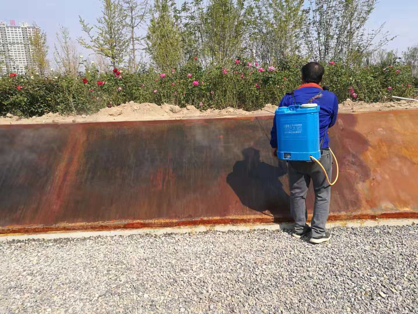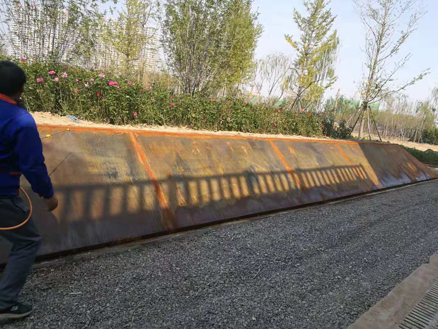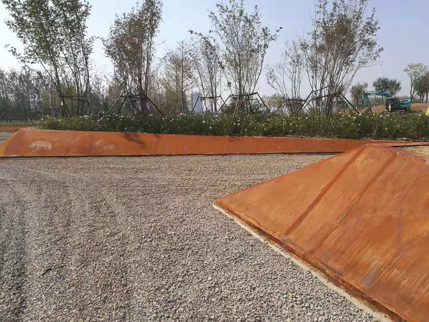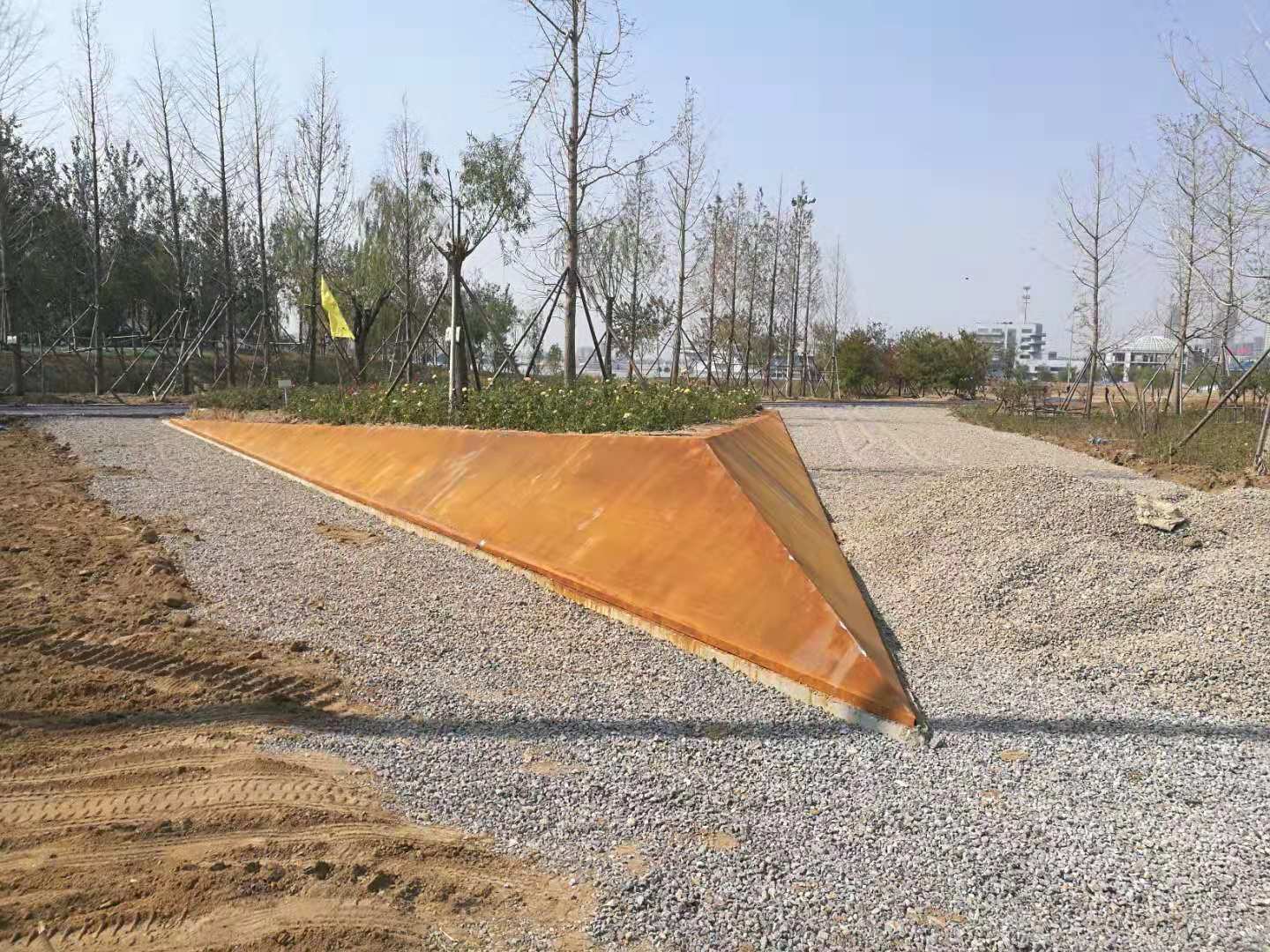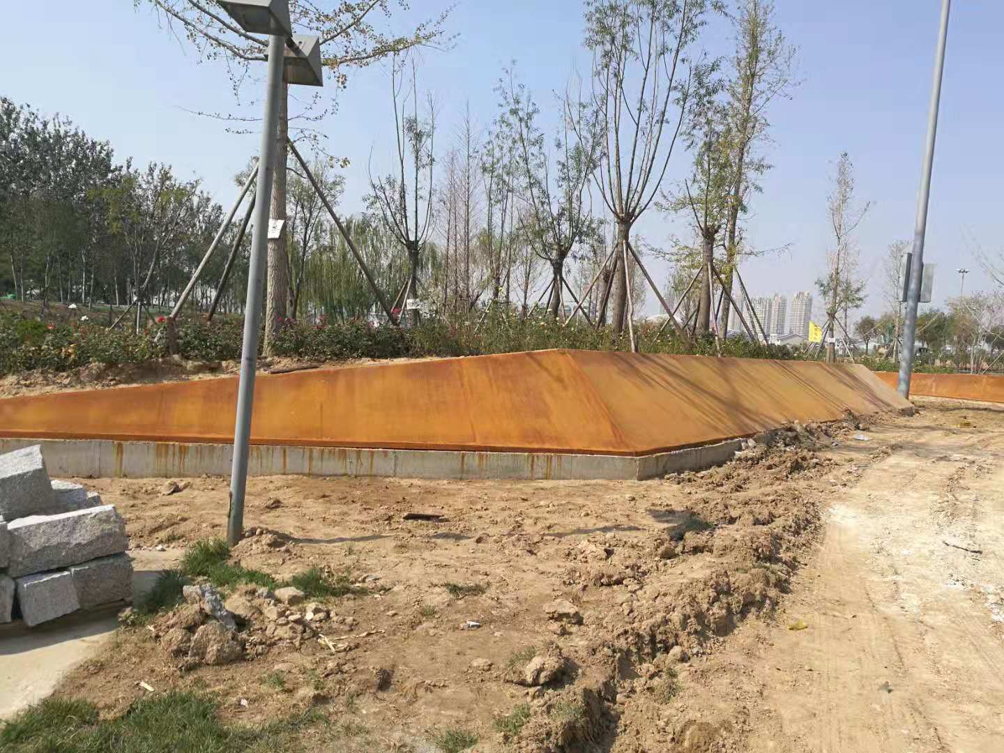 中海植物園即原來的中海景區(qū)東北角的原高爾夫球場區(qū)域,2018年改造升級(jí)為濱州中海植物園。所施工的銹板花池共7組,造型表面積共488平方米。造型板采用5mm厚銹板,支撐采用80mm*50mm*2.5mm的U形鋼。采用專業(yè)的耐候鋼生銹劑及固銹劑做表面處理。生銹的初期會(huì)呈黃色,然后隨著生銹進(jìn)程的推移,逐漸顯現(xiàn)金黃色,橙黃色,橙色,橙紅,紅褐色最后在紅褐,或者褐色穩(wěn)定下來。